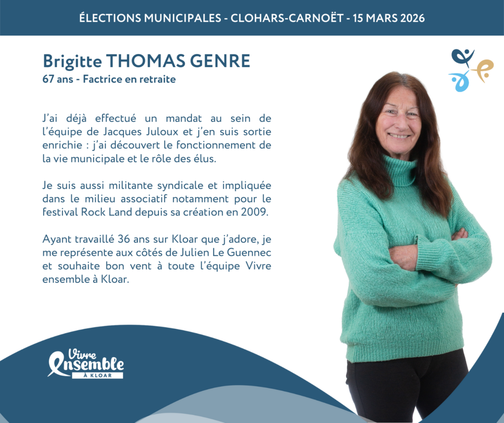 Ayant travaillé 36 ans sur Kloar que j’adore, je me représente aux côtés de Julien Le Guennec et souhaite bon vent à toute l’équipe Vivre ensemble à Kloar.
