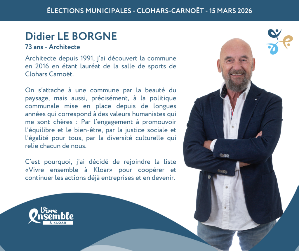 Didier LE BORGNE, 73 ans, architecte depuis 1991, référencé dans le domaine des bâtiments publics (hôpitaux – complexe aquatique –complexe sportif entre autres), j’ai découvert la commune en 2016 en étant lauréat de la salle de sports de Clohars-Carnoët. Avec mon épouse associée, nous sommes tombés sous le charme de la commune et de ses habitants, en nous promettant de venir y faire notre nid.