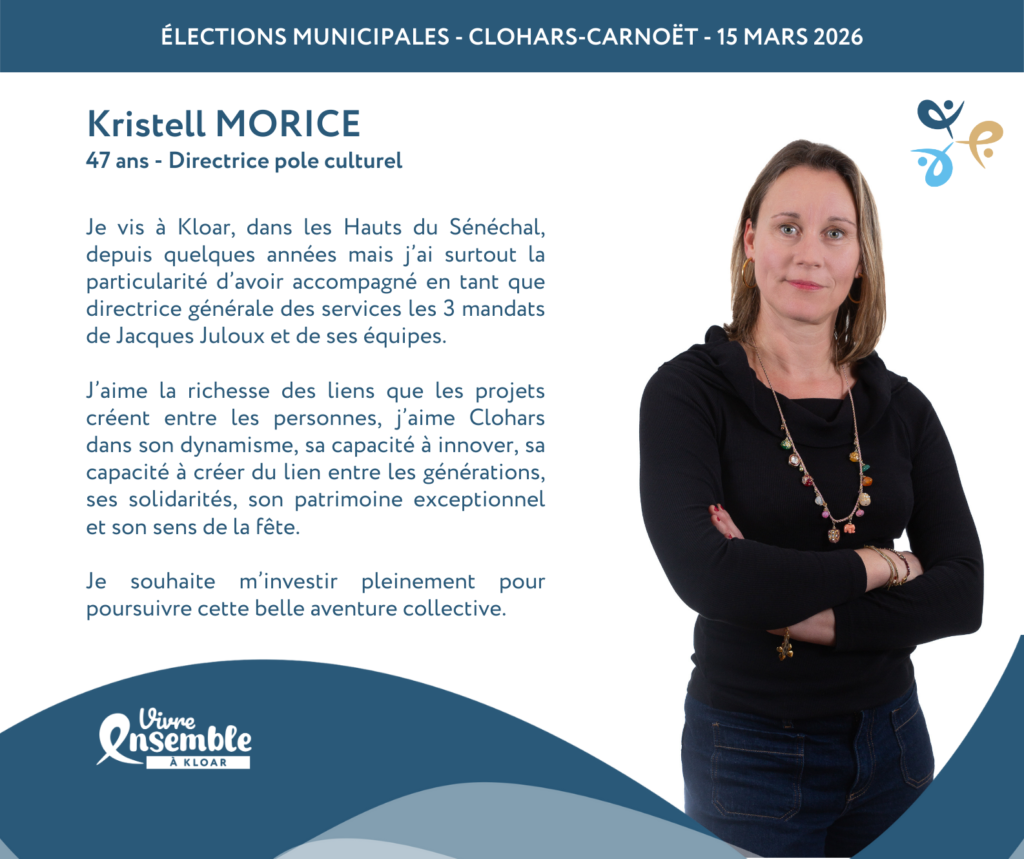Kristell MORICE : j’ai 47 ans, je vis en couple et j’ai un fils de 17 ans. Je vis à Kloar, dans les Hauts du Sénéchal, depuis quelques années mais j’ai surtout la particularité d’avoir accompagné en tant que directrice générale des services les 3 mandats de Jacques Juloux et de ses équipes.